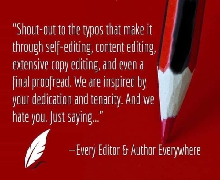 Quick Proof Review: I rode the roller coaster of emotions with getting my first round of proof copies for my novel. I posted about how unbelievably gratifying it was to hold my work in print form and it still is. Every time that I pick up that copy, it’s a rush. I sent some of those proofs out to friends and dove into my own to look for any lingering issues. (Which I found. I mean seriously, where do they even come from at this point? Typos / Missing Quotation Marks / Formatting issues – I’m looking at you – please see the note to the left. I wish I knew who to attribute this image to, because it is spot on and makes me laugh every time that I see it.) BUT. As marked up as that proof copy is, and as frustrating as it was, I am OVER THE MOON about that experience now. Why? One, because I got to spend several hours on the phone with a dear friend talking about the book and all the things. Two, because she became invested in the characters and told me she wanted more backstory. Not too much, just a few more lines here and there. That was like music to my ears and also gave me several ideas as I move forward with the next novel. Third, because it gave me the opportunity to fix those things and get one step closer to bringing the best version of it I can to you on August 3rd!