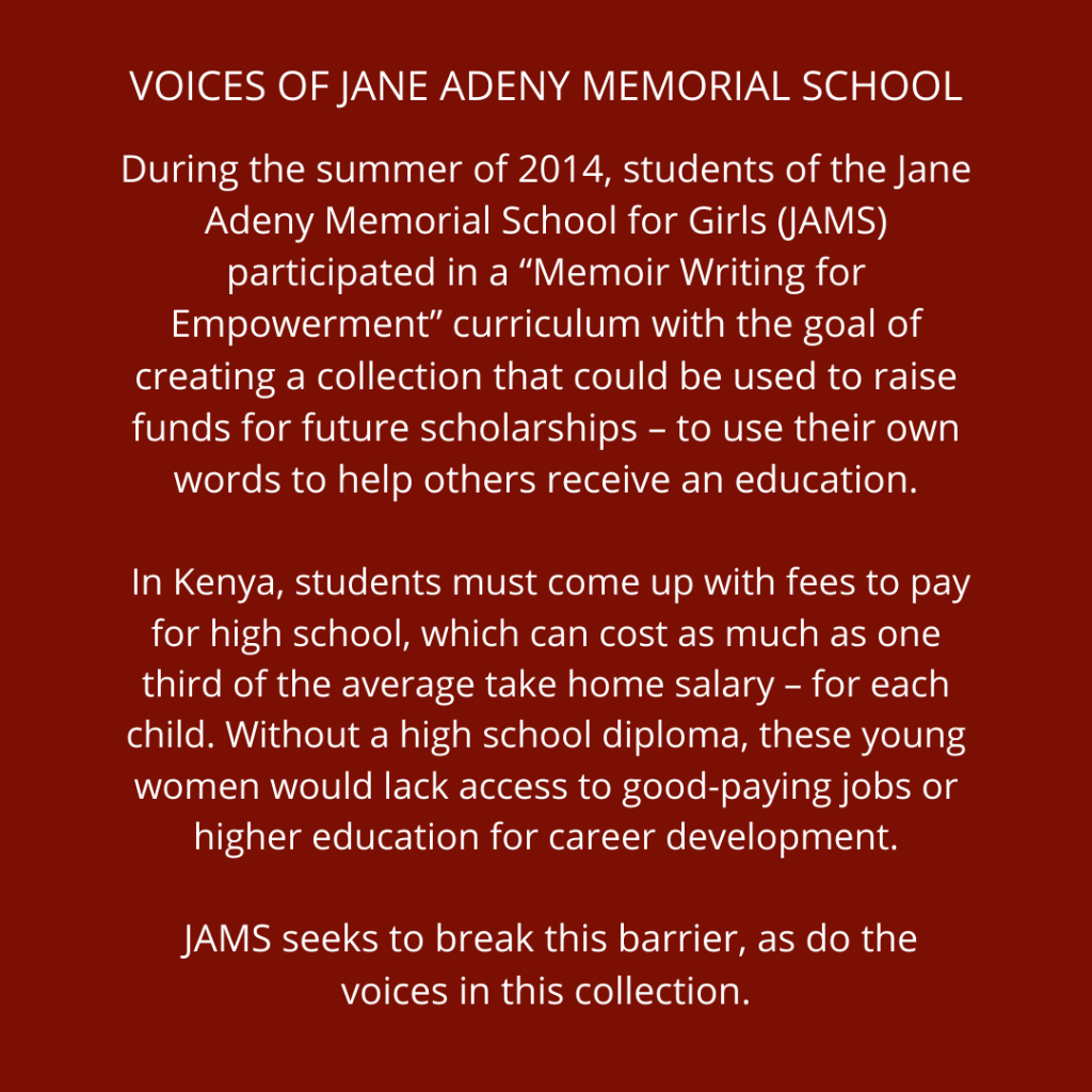 A collection of memoirs from students of the school for girls in Kenya, VOICES OF JANE ADENY MEMORIAL SCHOOL is filled with stories of adversity, triumphs, and resilience – journeys of transformation made possible through giving.