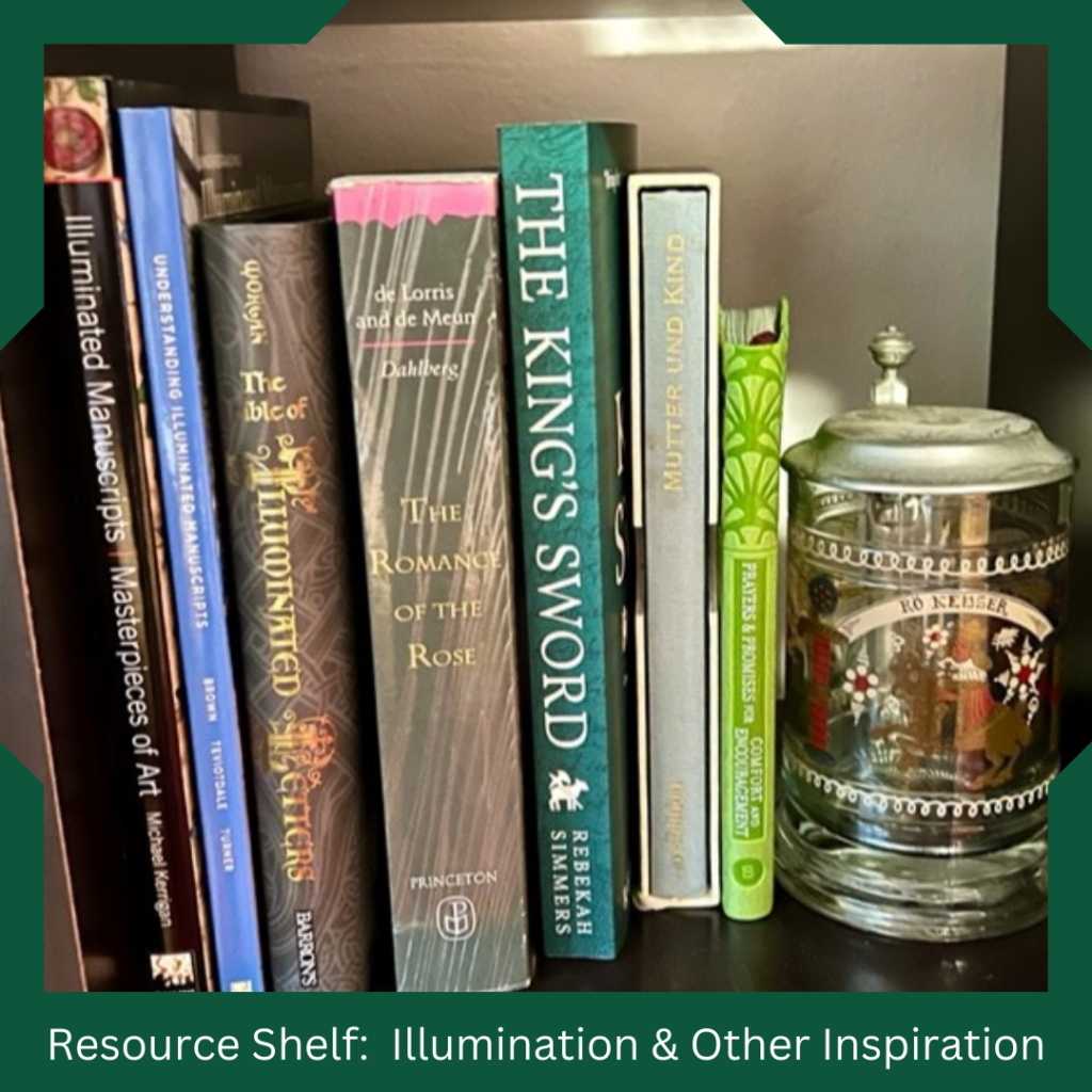 Having this designated physical space has allowed me to feel “settled” in so many ways. It’s allowed me to sort my research books into categories, which has helped immensely with the various parts of THE KING’S SWORD’s sequel and the other manuscripts that I’m working on. I’ve set up some happy things for character, setting, and visual inspiration, such as paintings, pictures, and prayer books reminiscent of Avelina’s. My goal was to create a quiet and comfortable area for writing, which the kids are also using for piano play, their own writing, and for homework.